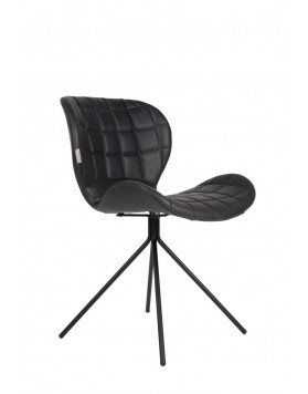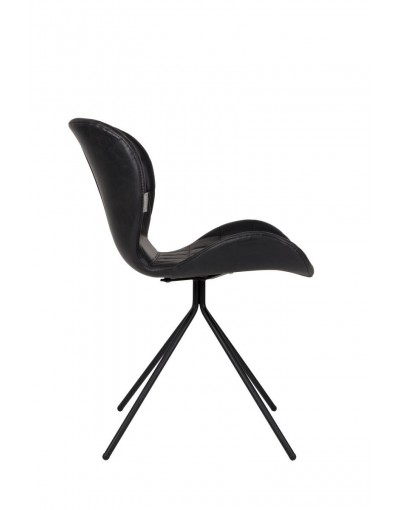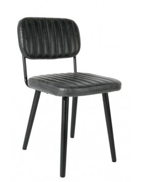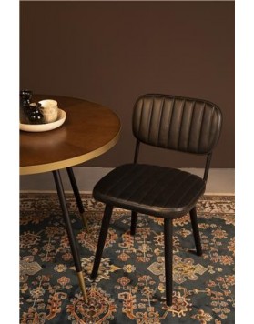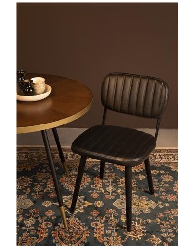 Silla estilo vintage con asiento y respaldo en cuero de PU y madera contrachapada. Las patas son de madera maciza de roble lacado en color negro y la estructura de acero con recubrimiento de polvo negro.