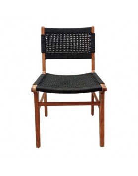 Su estructura está fabricada en madera maciza de acacia, el asiento y respaldo en cuerda trenzada, disponible en 3 colores: marrón, negro o naranja.