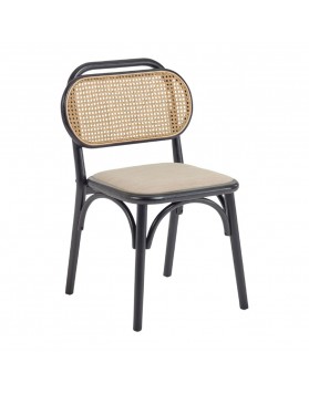 Tiene una estructura fabricada en madera maciza de olmo con asiento en ratán y respaldo en rejilla.