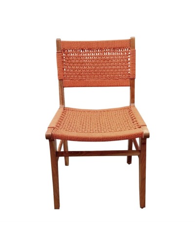Su estructura está fabricada en madera maciza de acacia, el asiento y respaldo en cuerda trenzada, disponible en 3 colores: marrón, negro o naranja.