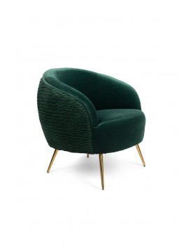 Sillón de estilo mid century, elegante, fabricado con asiento y respaldo de madera contrachapada, tapizado en 95% poliéster y 5% nylon y estructura de acero en acabado dorado o negro.