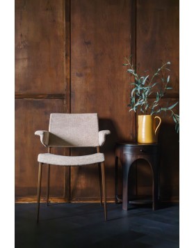 La silla Naida combina diseño refinado y comodidad excepcional. Con una estructura metálica de acabado bronce y un lujoso tapizado bouclé en tonos cálidos, aporta elegancia y un ambiente acogedor al comedor. Disponible en dos colores y diseñada para ofrecer un asiento cómodo, es perfecta tanto para cenas largas como para momentos de relax