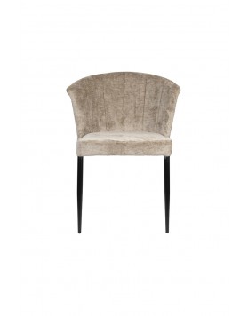 La silla Franky aporta calidez al comedor gracias a su tapizado bouclé en un tono cálido y suave. Su diseño tipo bañera ofrece un asiento muy cómodo para permanecer sentado durante horas. Destaca especialmente por su base metálica con pintura metalizada a juego con la tapicería, creando una pieza visualmente cohesionada y distintiva.