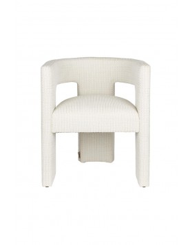 La silla Franky aporta calidez al comedor gracias a su tapizado bouclé en un tono cálido y suave. Su diseño tipo bañera ofrece un asiento muy cómodo para permanecer sentado durante horas. Destaca especialmente por su base metálica con pintura metalizada a juego con la tapicería, creando una pieza visualmente cohesionada y distintiva.