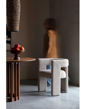 La silla Naida combina diseño refinado y comodidad excepcional. Con una estructura metálica de acabado bronce y un lujoso tapizado bouclé en tonos cálidos, aporta elegancia y un ambiente acogedor al comedor. Disponible en dos colores y diseñada para ofrecer un asiento cómodo, es perfecta tanto para cenas largas como para momentos de relax
