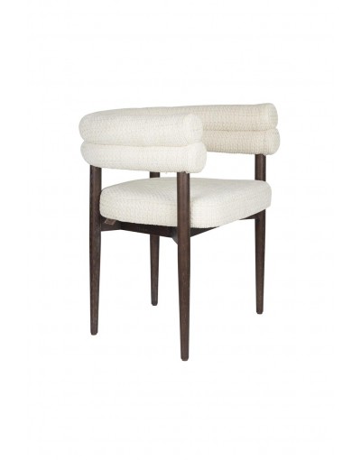 La silla Fenna ofrece gran comodidad gracias a su asiento tipo bañera tapizado en suave tela bouclé. Su diseño cálido y acogedor se complementa con patas cónicas de madera que aportan contraste y elegancia. Disponible en varias combinaciones, convierte cualquier estancia un espacio atractivo y confortable para reuniones largas y agradables.