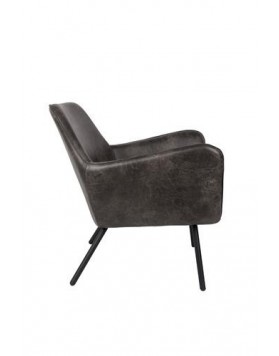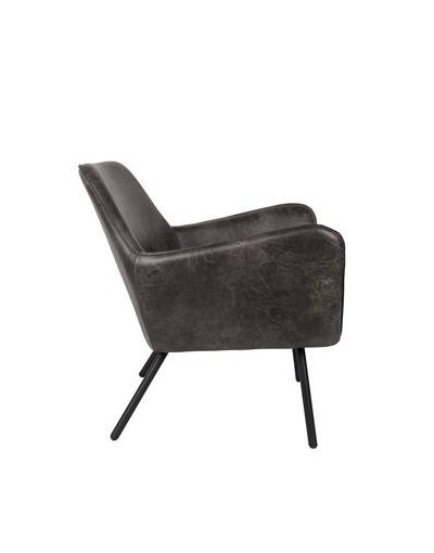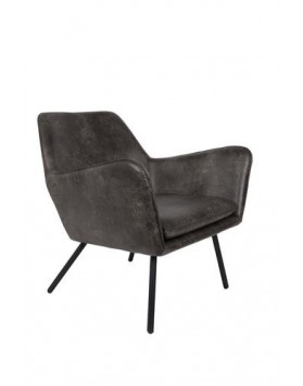 Butaca nórdica con tapizado en cuero PU vintage (para acabados marrón y gris oscuro) o tejido de poliéster aterciopelado (para acabados dorado, azul y verde), carcasa de madera contrachapada y asiento de espuma. Estructura de hierro pintado de negro.
