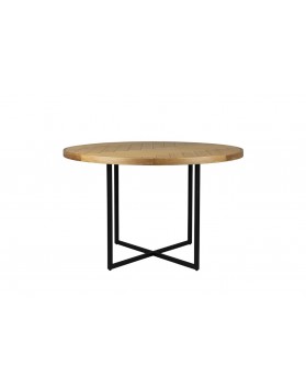 Mesa de comedor redonda con tablero de teca reciclada de 25 mm en acabado natural o en negro mate. Borde chapado en teca con lacado NC natural. Patas cónicas de acero negro mate revestido (6,7 - 2,7 cm de diámetro)