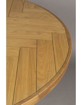 Esta mesa de centro o auxiliar se inspira en el movimiento ondulante del mar reflejado en las formas orgánicas de la base. Además, la madera de roble con acabado natural o nogal desprende mucha calidez. Junto con el tablero redondo de cristal, crea un aspecto atmosférico y ligeramente retro propio de un interior de los años setenta.