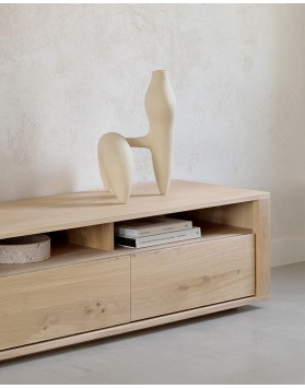 Los sutiles contornos de las puertas del mueble y la distinguida forma de los pies son lo que hacen que esta colección sea tan especial. De madera maciza, las puertas y os cajones de este mueble de almacenamiento no tienen tiradores y cuentan con un mecanismo de cierre suave.