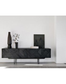 En su búsqueda por añadir movimiento a la superficie, al superponer y combinar formas triangulares se creó una interesante composición en teca. Terminaron cepillando la superficie para resaltar la veta y acentuar aún más la sensación de movimiento. Utilizado originalmente para el popular aparador Graphic en teca, el patrón se traduce ahora perfectamente en un nuevo mueble de TV.
