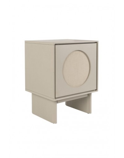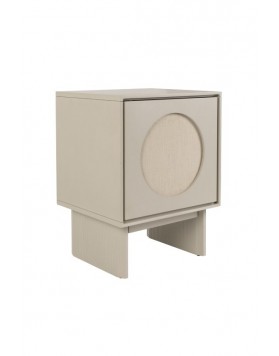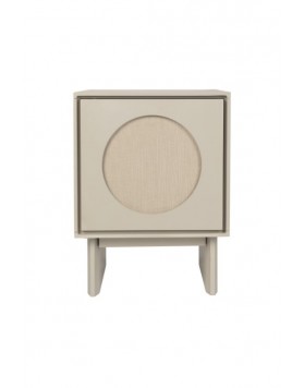 La puerta de esta mesita está adornada con un suave círculo de tela. Los amplios compartimentos con estante ofrecen espacio para guardar lo esencial. Las elegantes patas proporcionan estabilidad, mientras que la madera pintada en gris veteado resalta la belleza natural del mueble.
