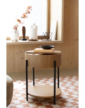 Realza tu espacio vital con las elegantes y versátiles mesas Slides. La mesa auxiliar Slides cuenta con un ingenioso tablero deslizante. Un compartimento oculto para almacenamiento se revela al abrir el tablero. Elaboradas con exquisita atención al detalle, estas mesas lucen una cautivadora combinación de chapa de roble y patas de metal con recubrimiento en polvo negro, creando una armoniosa fusión de belleza natural y diseño contemporáneo.