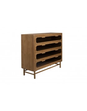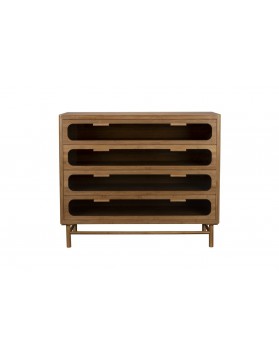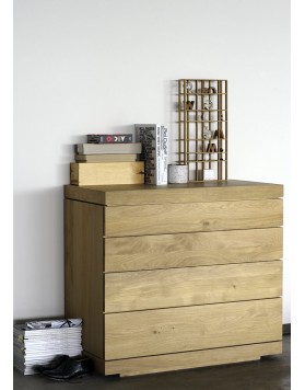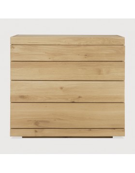 La cómoda Burger destaca por sus patrones de madera natural en cascada que aportan un aspecto único. Está fabricada en roble macizo, lo que garantiza solidez y durabilidad. Incorpora cuatro cajones con apertura a presión para mayor comodidad. Su acabado en aceite de cera dura realza la textura y protege la madera.