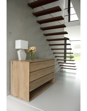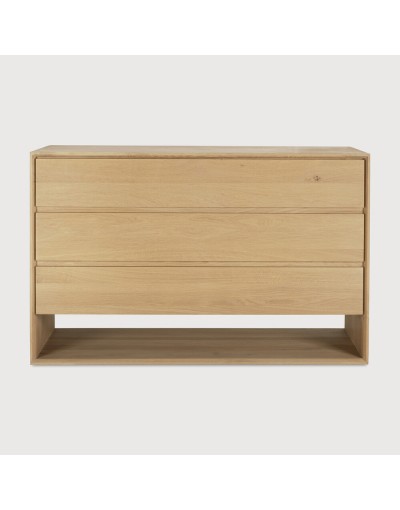 La colección Nordic destaca por su diseño refinado y minimalista, inspirado en la estética escandinava. Utiliza madera maciza para aportar calidez y autenticidad. Sus bordes biselados añaden un detalle elegante y distintivo. La cómoda ofrece tres cajones amplios fabricados completamente en roble macizo.