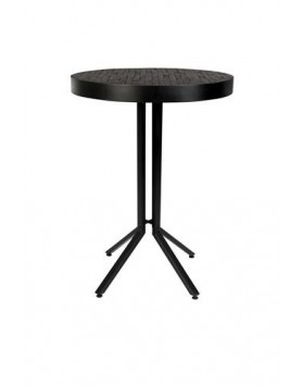 Mesa alta de bar con tablero de teca reciclada lacada con acabados natural o negro. Patas de acero pintado en polvo y tapas de plástico ajustables.