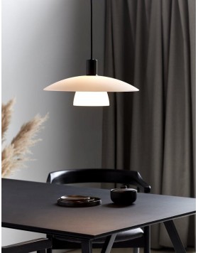 En vidrio blanco opalino, con su forma redondeada, brinda una expresión elegante y clásica. Las lámparas colgantes de techo vienen con dos tapas, una de metal negro mate formando un diseño clásico y minimalista y otra de latón cepillado, de un diseño mas cálido y moderno, para que puedas elegir el estilo que quieras.