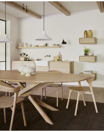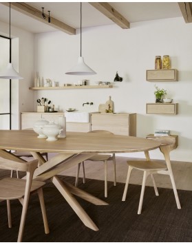 La mesa de comedor Slice, fabricada en roble macizo, destaca por su diseño simple a primera vista, pero enriquecido con sutiles detalles en sus esquinas. Estos pequeños toques aportan un aire de sofisticación lúdica sin perder su funcionalidad. Es una pieza sólida, elegante y perfectamente integrada en espacios contemporáneos.