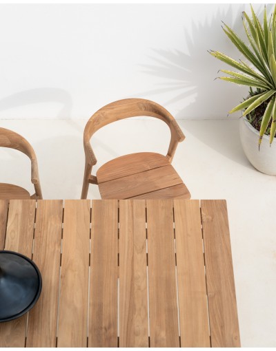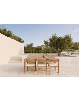 La colección Bok, que recuerda a los cuernos curvados de una cabra, combina la elegancia escultural y la artesanía contemporánea en una forma grácil y aérea. Al igual que su silla a juego, la mesa de comedor Bok es otro diseño exclusivo. Su forma ligera y su construcción sólida como una roca hacen de esta pieza un diseño atemporal y extraordinario para disfrutar durante años, mientras que el tablero acanalado adaptado de teca maciza hace que la vida al aire libre sea un simple placer.