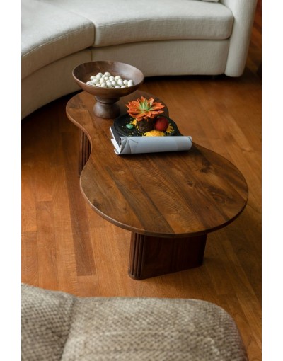 En la zona de estar, se pasa mucho tiempo. Por eso, añada un toque especial a este espacio con la impresionante serie Feller. Estas mesas, auxiliar y de centro están hechas de madera maciza de mango, que irradia calidez. Además, destacan por su diseño único, las dos mesas difieren ligeramente en altura, lo que permite que se integren formando un conjunto. La base forma un ángulo, con el tablero rectangular con bordes redondeados que parece descansar ligeramente sobre ella.