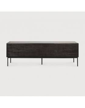El mueble de televisión Grooves de teca maciza es, como mínimo, conmovedor. Cada una de las líneas que se ven está tallada a mano, lo que hace que cada pieza sea realmente única. Las pequeñas imperfecciones forman parte de la historia, más aún: realzan el carácter de Grooves. El resultado es una superficie ligeramente diferente cada vez, cada una con su propio ritmo y dinámica. La hermosa teca oscura continúa en el interior, donde los estanterías y los cajones guardarán sus objetos más preciados.