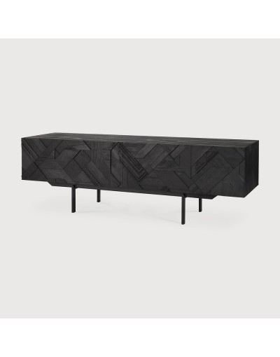 En su búsqueda por añadir movimiento a la superficie, al superponer y combinar formas triangulares se creó una interesante composición en teca. Terminaron cepillando la superficie para resaltar la veta y acentuar aún más la sensación de movimiento. Utilizado originalmente para el popular aparador Graphic en teca, el patrón se traduce ahora perfectamente en un nuevo mueble de TV.