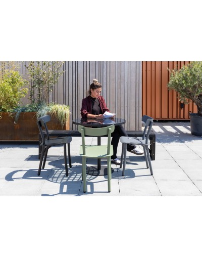 Fabricada íntegramente en aluminio sin mantenimiento. Las patas traseras atravesaran el delgado asiento y permite que se apilen hasta cuatro piezas.