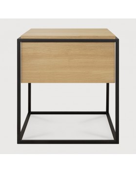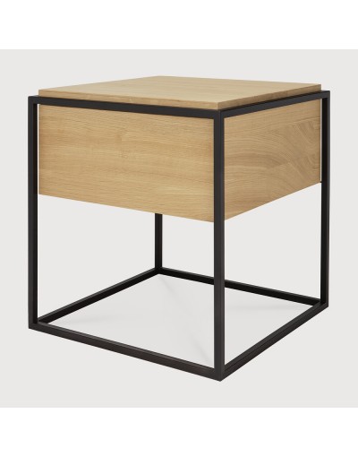 Practicidad sin renunciar al estilo. La minimalista mesita de noche Monolit de roble macizo ofrece un amplio espacio de almacenamiento y sirve de práctico soporte para los objetos de la cabecera.