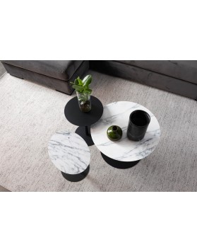 La serie Snow cuenta con mesas auxiliares en diferentes formas y tamaños, en negro y blanco mármol, satinado cepillado y latón cepillado.