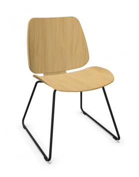 Silla con o sin brazos, con estructura de tubo de acero de Ø18 mm pintado o cromado. Equipada con tacos rótula de polipropileno (opcionalmente con fieltro). Asiento y respaldo en madera contrachapada de roble o nogal, con posibilidad de tapizado frontal en asiento o en asiento y respaldo.