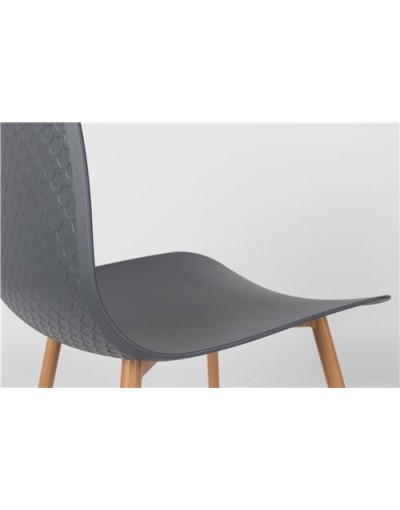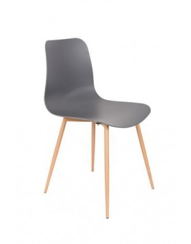 Silla ligera de carcasa de polipropileno con dibujo en relieve en la parte posterior y patas de hierro chapadas en madera. Disponible en blanco, gris verde y azul.