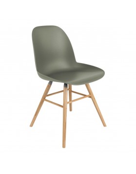 Silla ligera de carcasa de polipropileno con dibujo en relieve en la parte posterior y patas de hierro chapadas en madera. Disponible en blanco, gris verde y azul.
