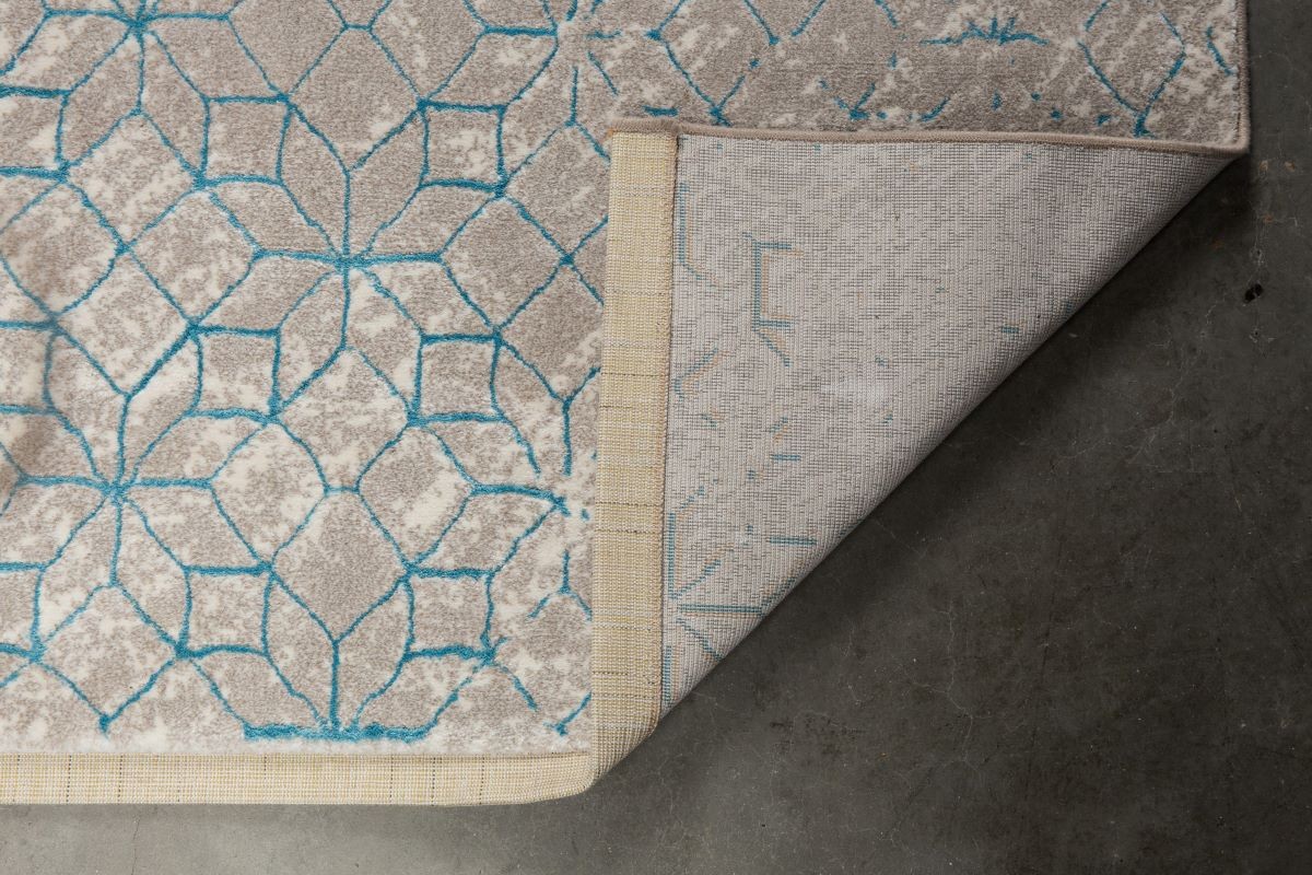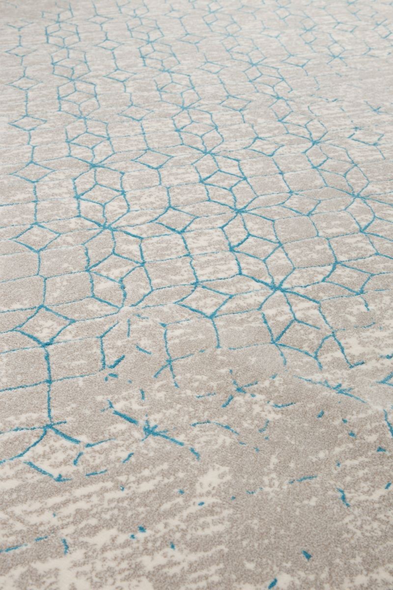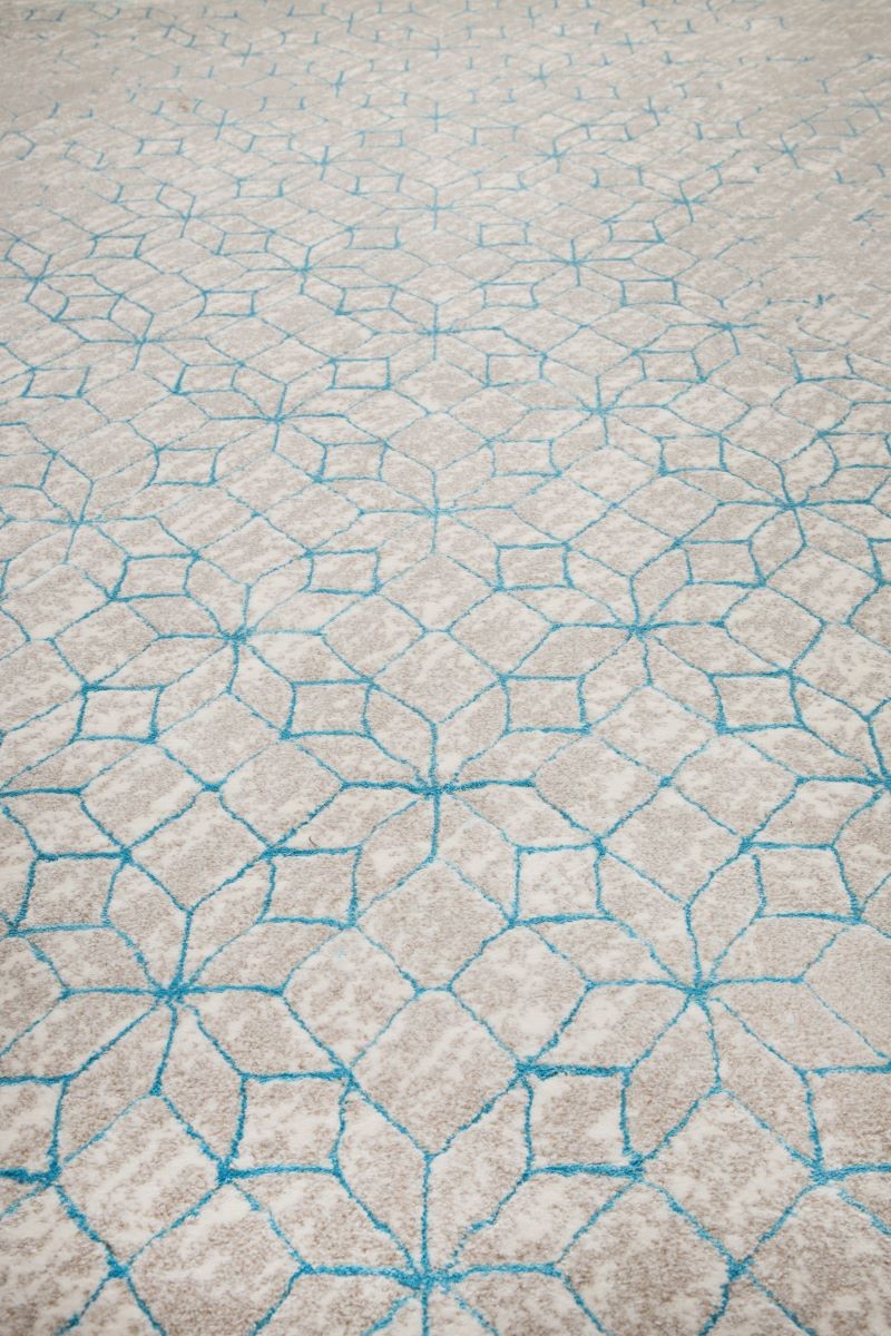 Alfombra de estilo nordico que nos recuerda la forma del kaleidoscopio. Tejida a máquina, 60%polypropylene 40% polyester. Reverso terminado en yute.