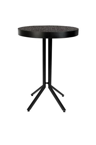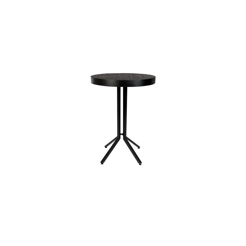 Mesa alta de bar con tablero de teca reciclada lacada con acabados natural o negro. Patas de acero pintado en polvo y tapas de plástico ajustables.