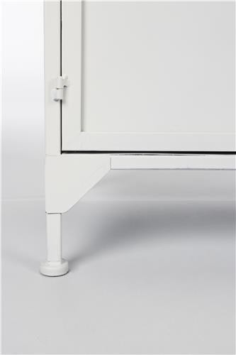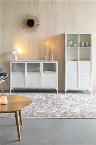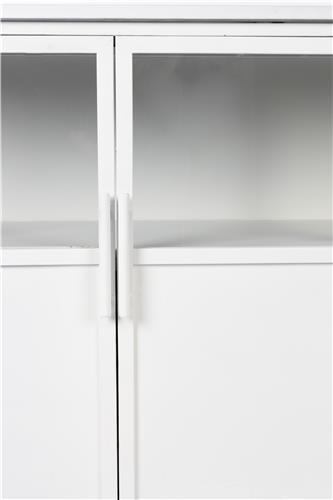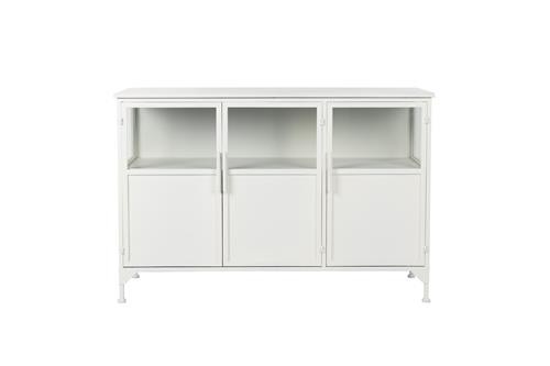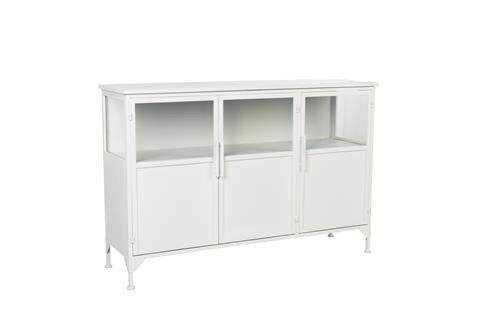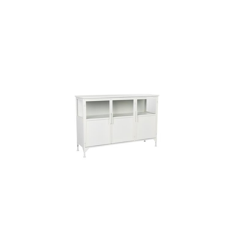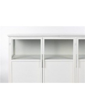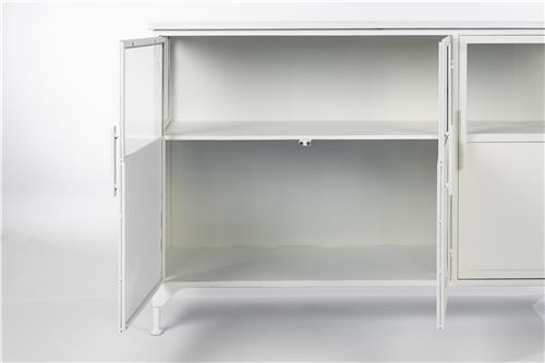 Aparador de estilo industrial fabricado en hierro pintado de polvo blanco con ventanas de vidrio templado transparente.