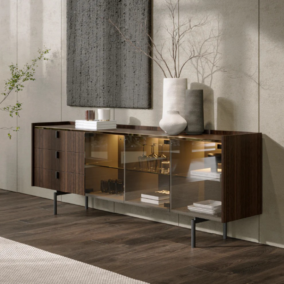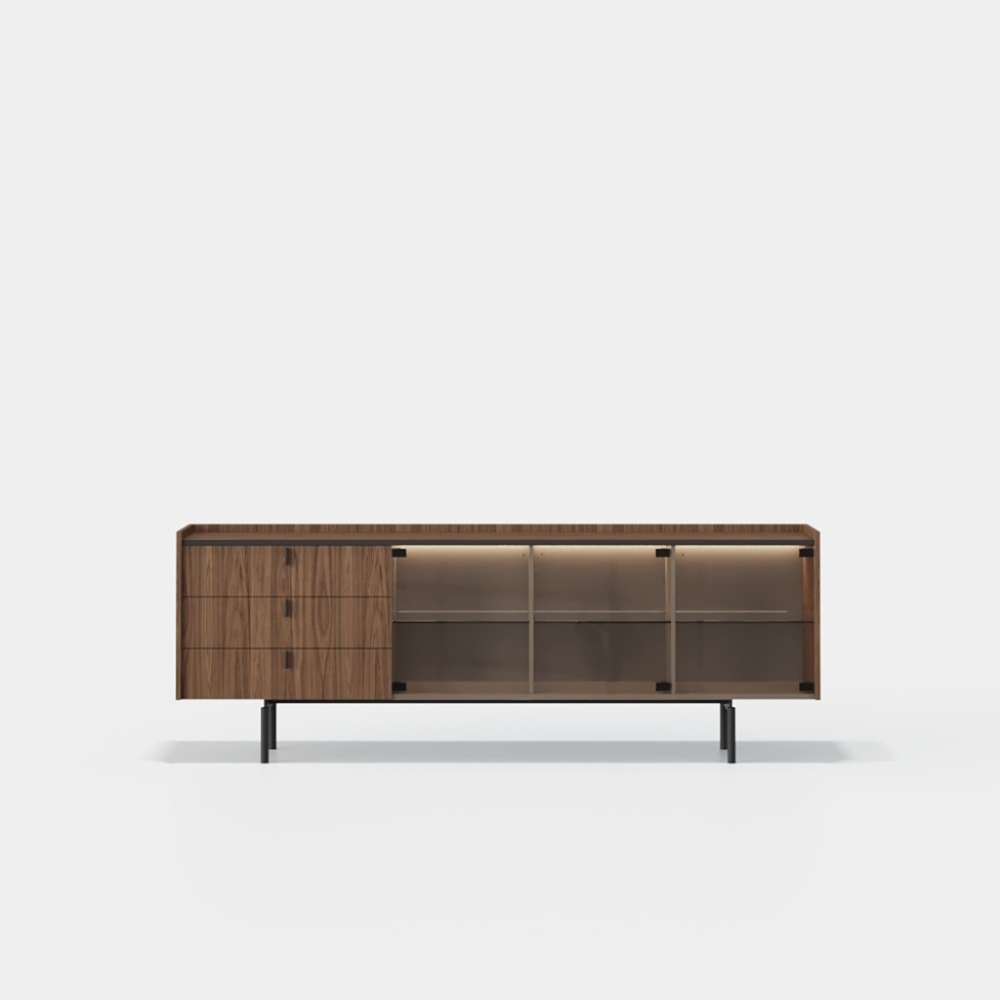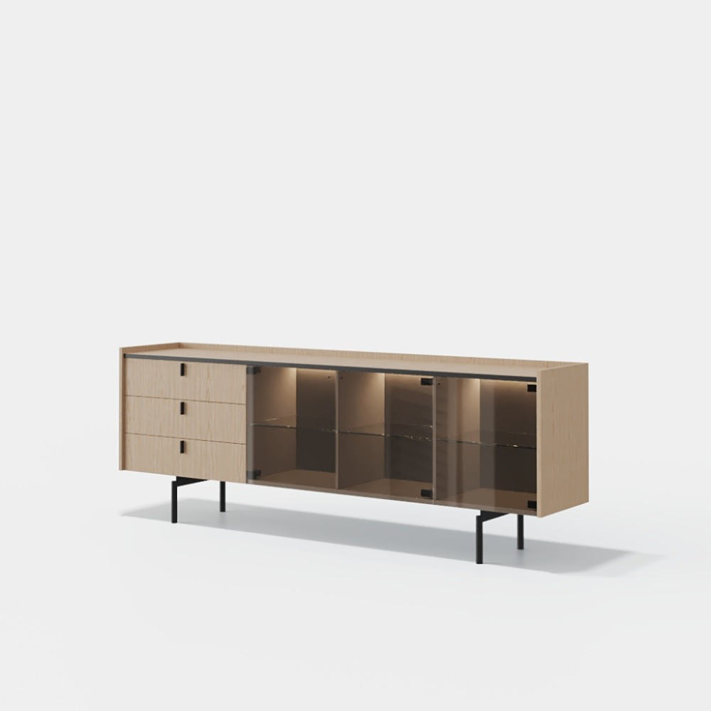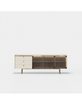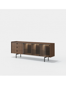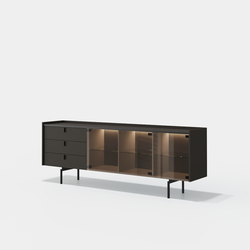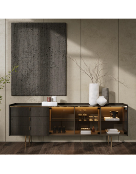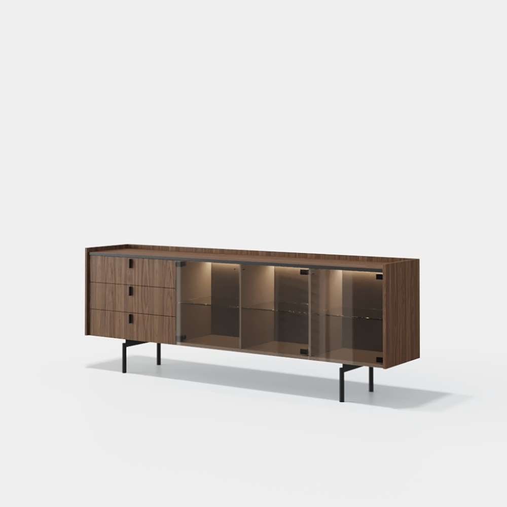 Sofisticado aparador con cajones y puertas, diseñado para ofrecer estilo y funcionalidad. Disponible en maderas nobles (Nogal, Roble, Eucalipto o Fresno en acabado mate), con tiradores y patas en laca epoxi. Incorpora cristal Bronce, lacado en mate o brillo e iluminación LED opcional.