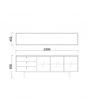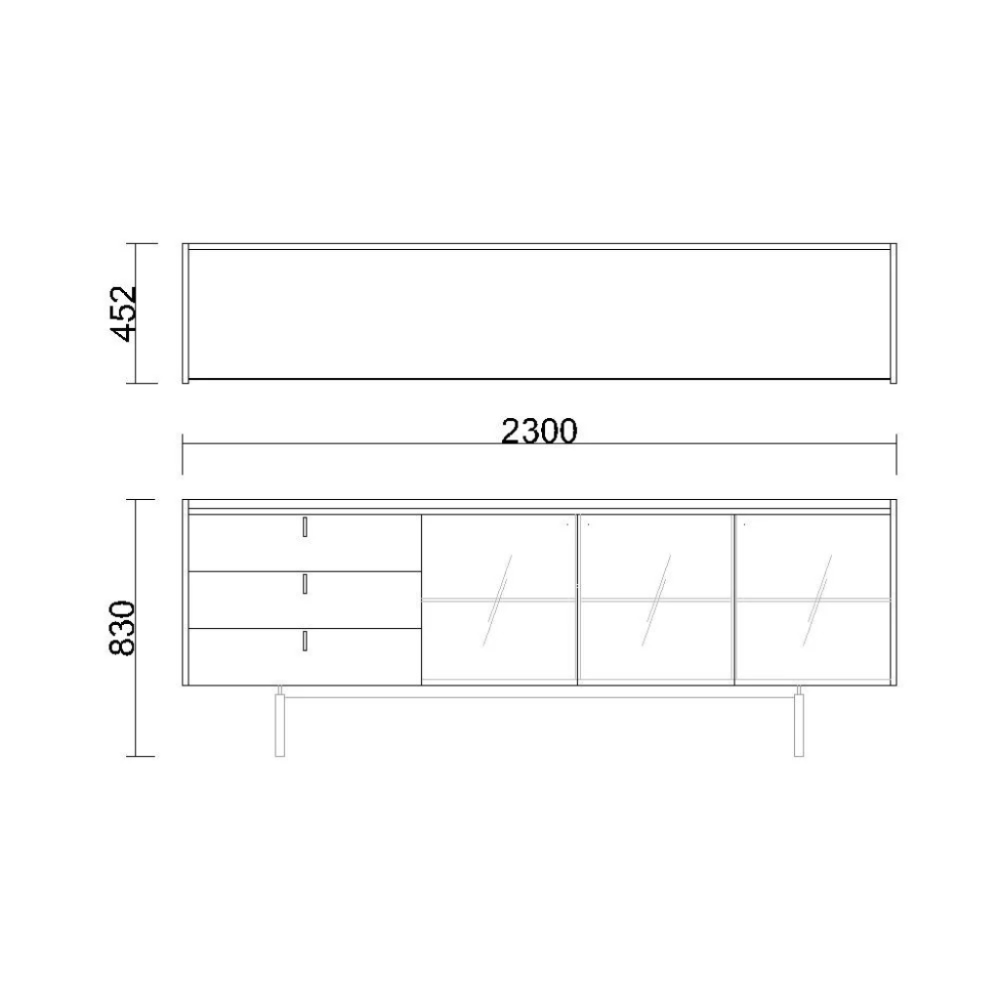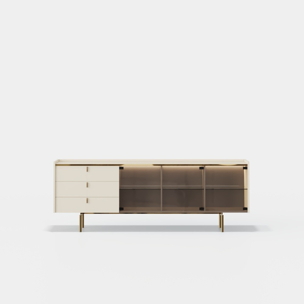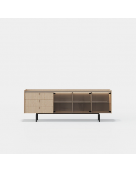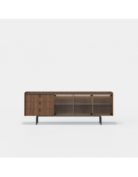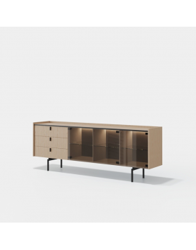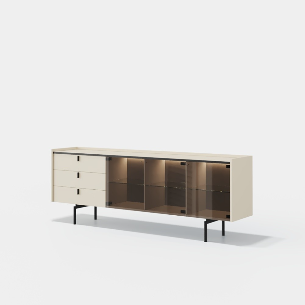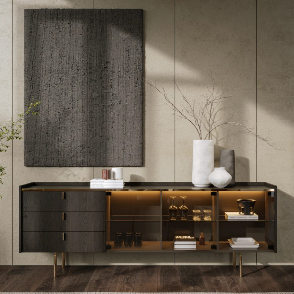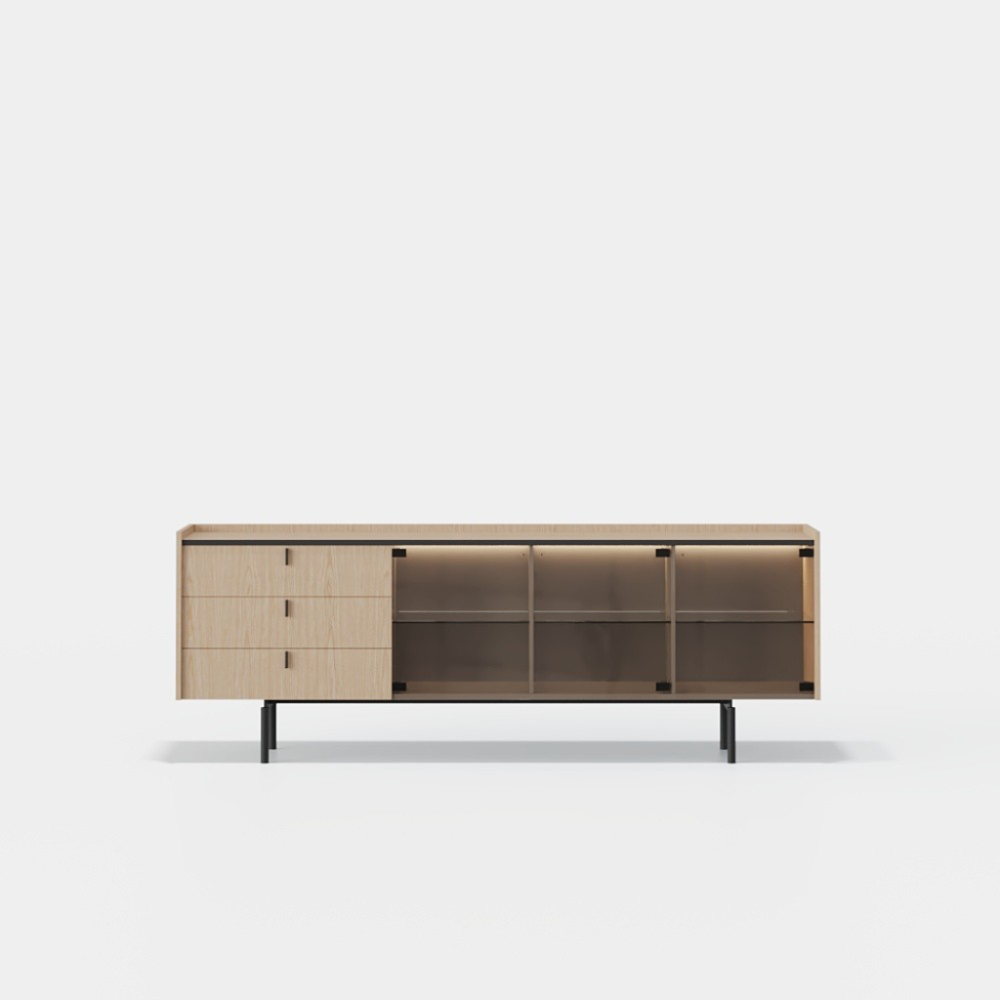 Sofisticado aparador con cajones y puertas, diseñado para ofrecer estilo y funcionalidad. Disponible en maderas nobles (Nogal, Roble, Eucalipto o Fresno en acabado mate), con tiradores y patas en laca epoxi. Incorpora cristal Bronce, lacado en mate o brillo e iluminación LED opcional.