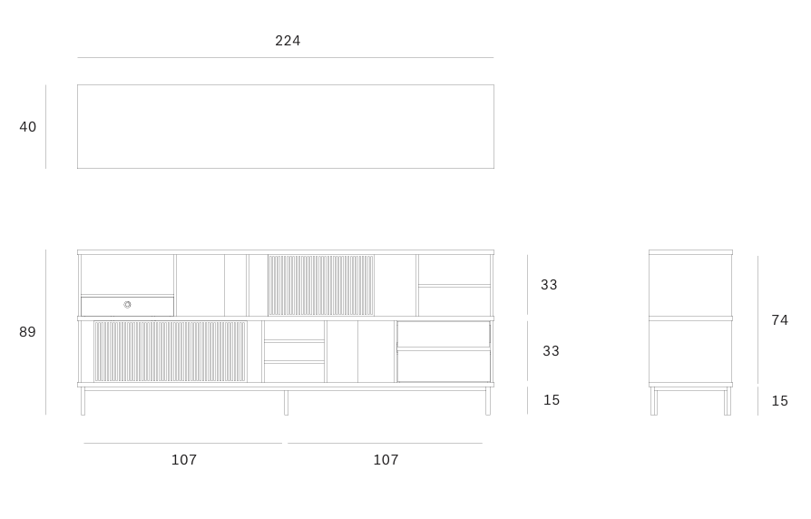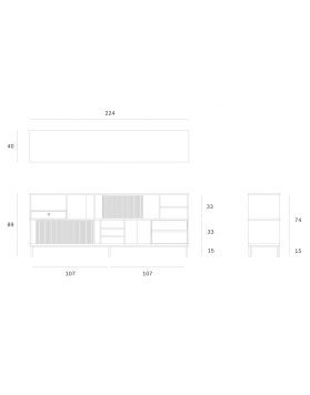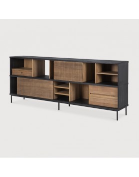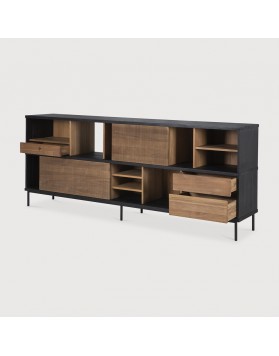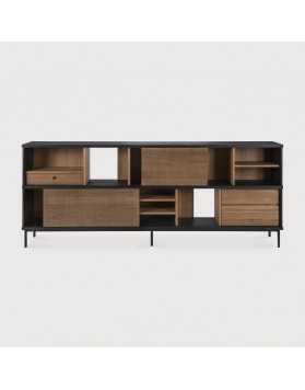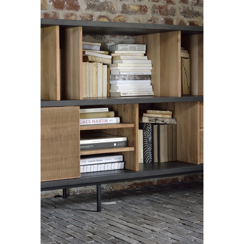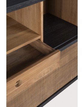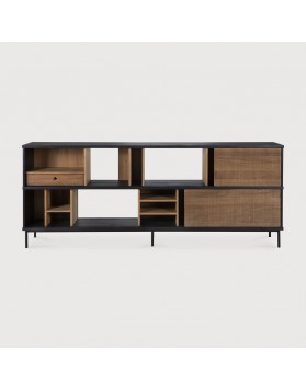 El aparador Oscar combina diseño funcional y arte manual en una pieza que destaca por su estética cálida y natural. Fabricado en teca maciza —en acabado natural o teñida de negro— y sostenido por patas de metal negro, ofrece una estructura robusta con un estilo contemporáneo. Sus huecos abiertos permiten exhibir libros, decoraciones o piezas personales, mientras que las dos puertas correderas y los tres cajones facilitan un almacenamiento organizado. Las ranuras talladas a mano en las puertas lo convierten en un mueble singular, y su falta de acabado protector preserva la autenticidad de la madera, requiriendo un cuidado adecuado para mantener su belleza con el tiempo.