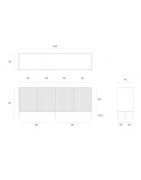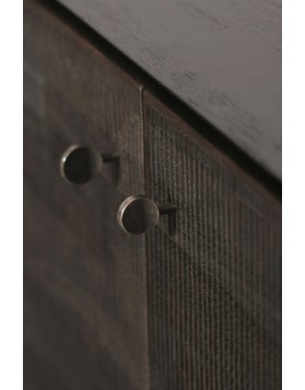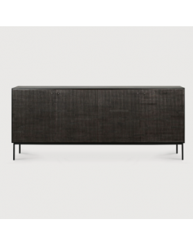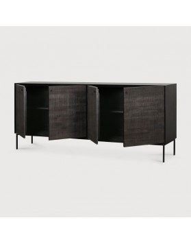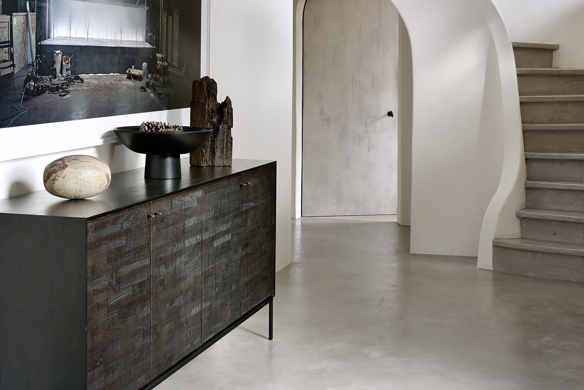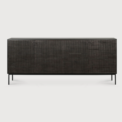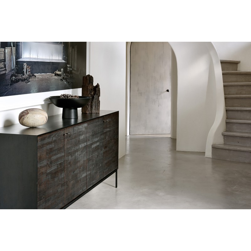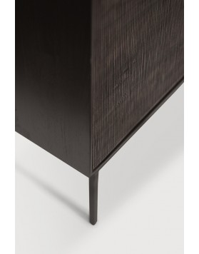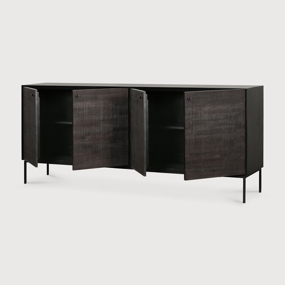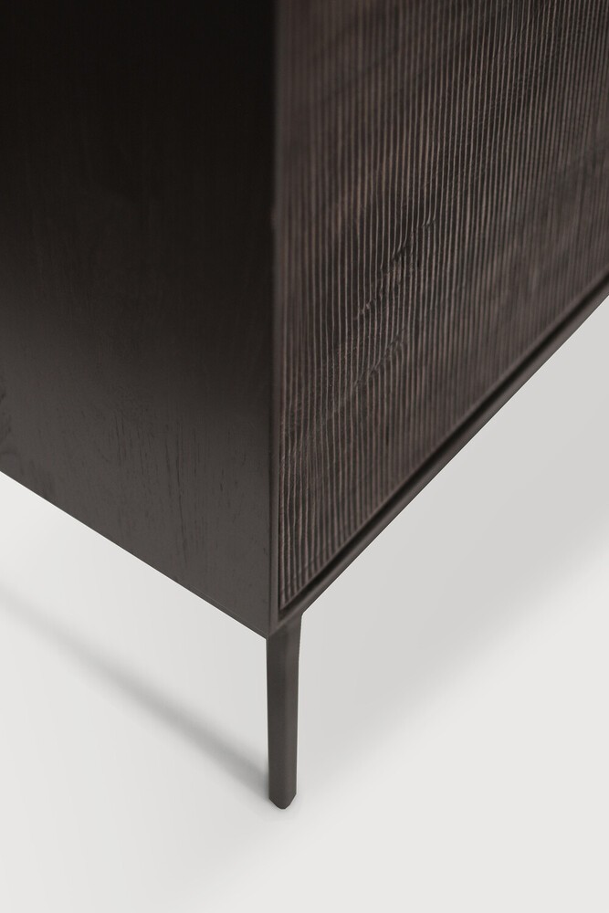 El aparador Grooves es, como mínimo, conmovedor. Cada una de las líneas que se ven está tallada a mano, lo que hace que cada pieza sea realmente única. Las pequeñas imperfecciones forman parte de la historia, más aún: realzan el carácter de Grooves. El resultado es una superficie ligeramente diferente cada vez, cada una con su propio ritmo y dinámica. La hermosa teca de color oscuro continúa en el interior, donde los estanterías guardarán sus objetos más preciados.