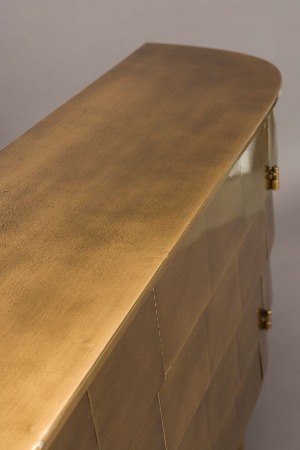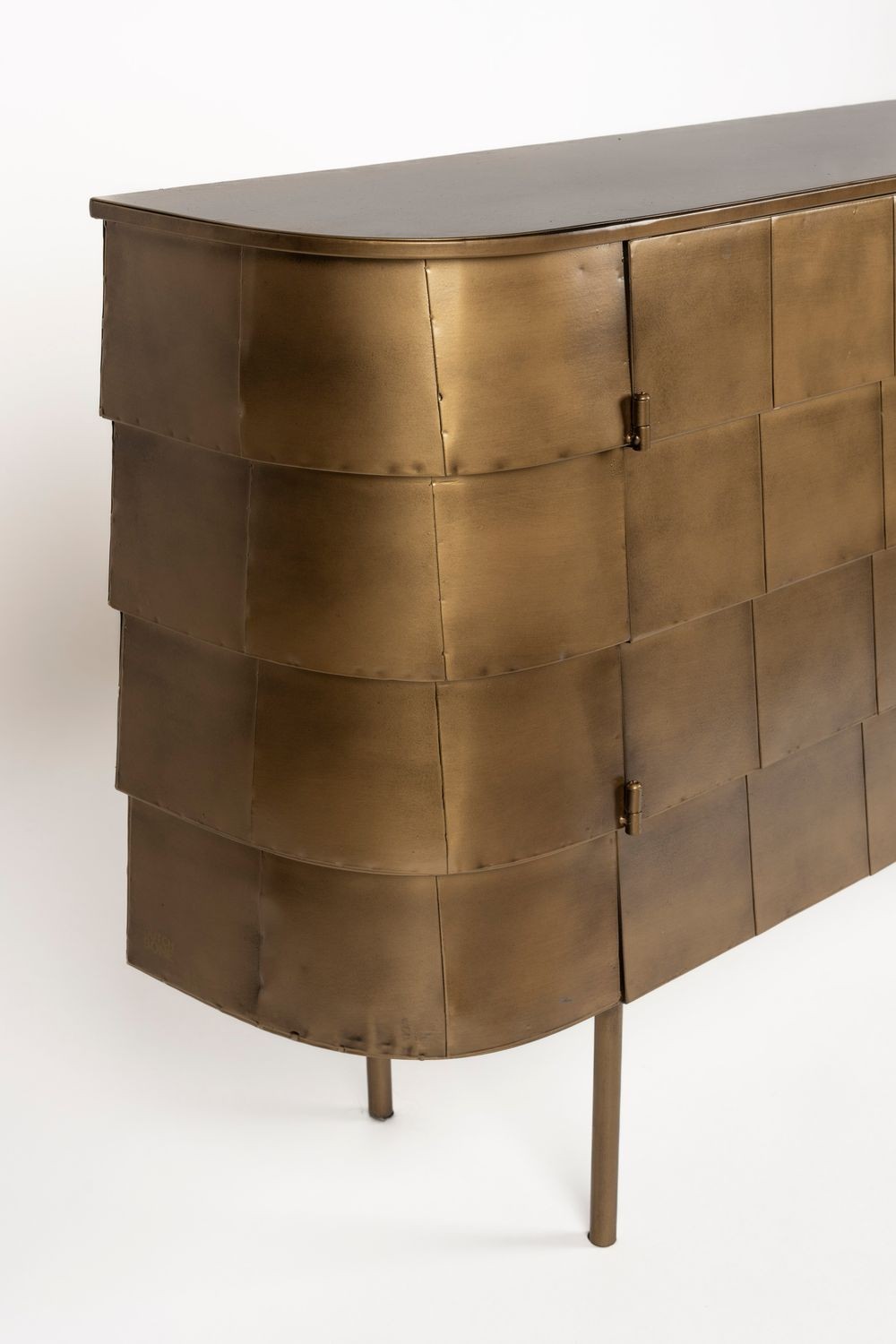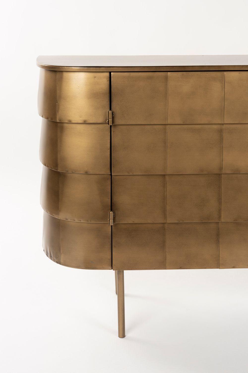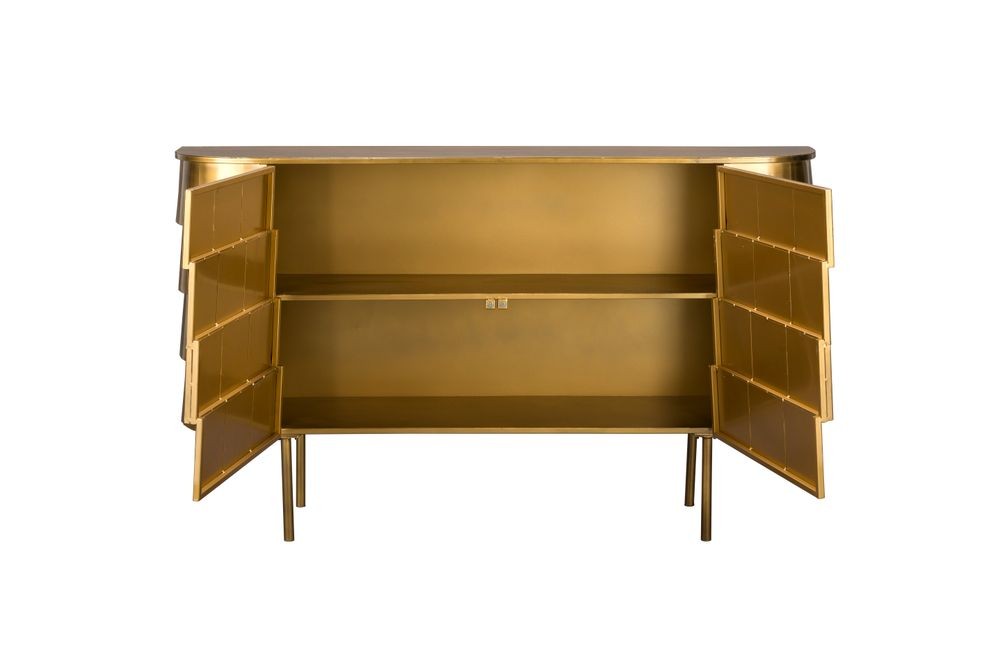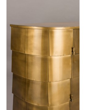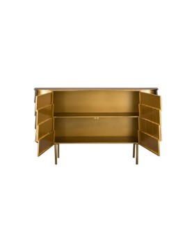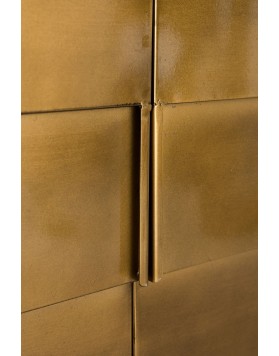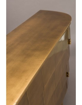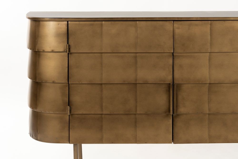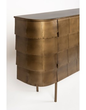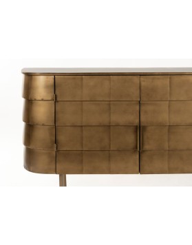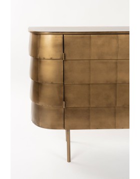 El aparador hanna está fabricado completamente en metal, con un sofisticado acabado dorado de aspecto envejecido. Su diseño imperfecto y artesanal le confiere un encanto vintage auténtico. Las ligeras variaciones en su acabado hacen que cada unidad sea exclusiva. Cuenta con puertas discretas que esconden un práctico espacio de almacenamiento. Perfecto para quienes buscan una pieza decorativa con carácter y funcionalidad