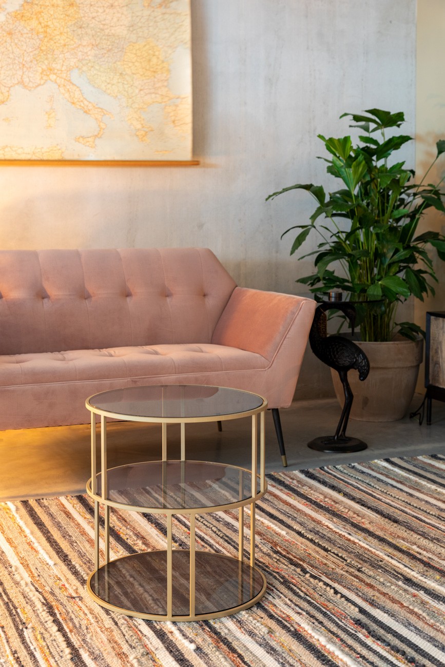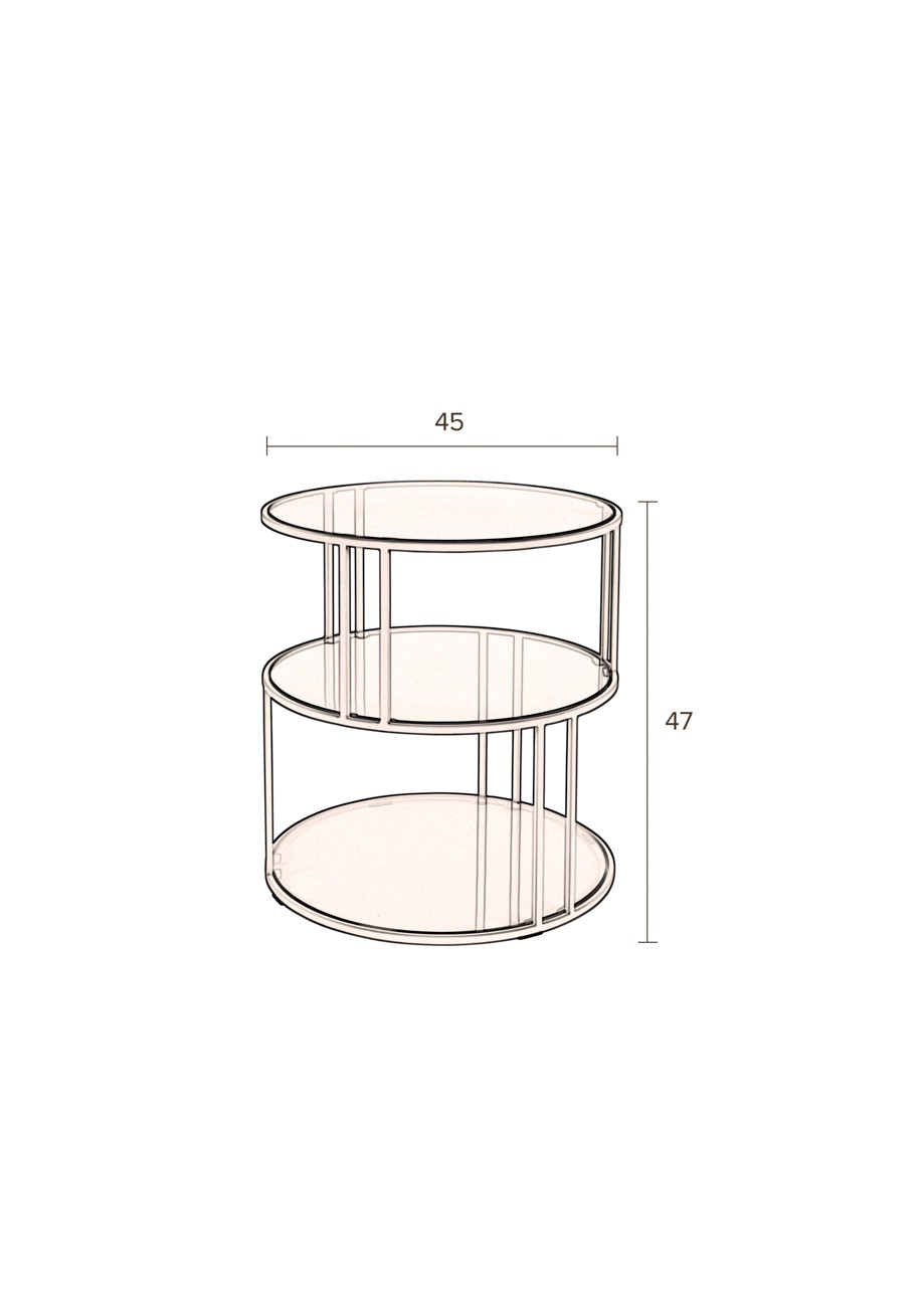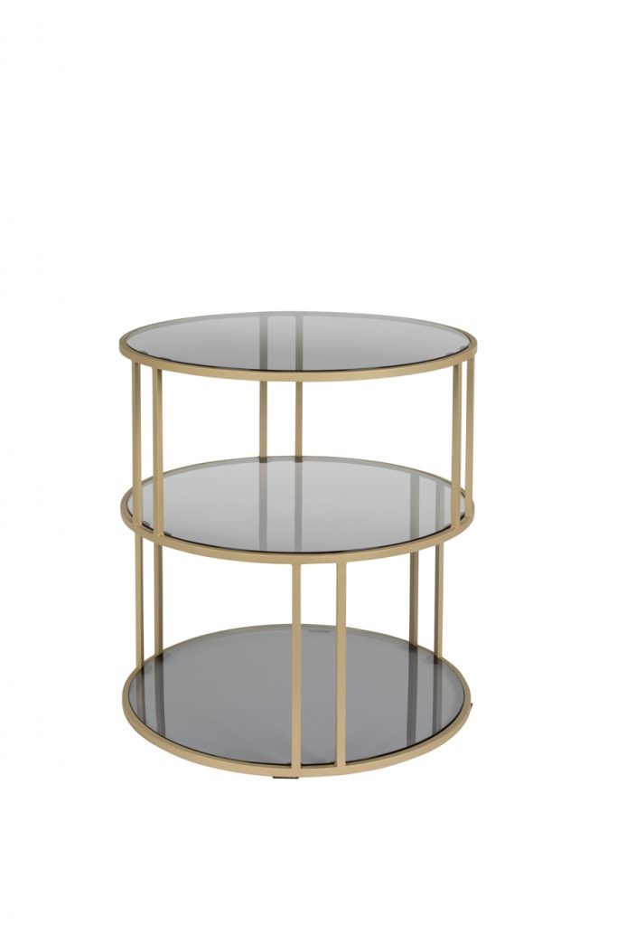 La mesa auxiliar Torn presenta un diseño moderno y de moda influenciado por la década de 1970. Esta pequeña mesa combina superficies de vidrio ahumado y un marco de color dorado mate para crear un aspecto atractivo. Esta mesa auxiliar tiene varios niveles, lo que la hace práctica e ideal para poner cosas a un lado o exhibir sus artículos favoritos.