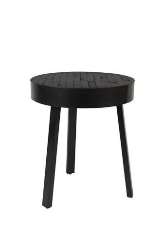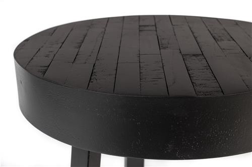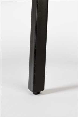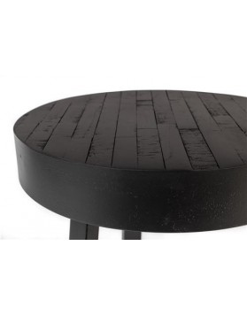 Mesa de madera de teca reciclada en lacado natural (a base de agua) o acabado lacado negro con borde de acero suave de 74 mm. Estructura de acero con melamina negra envejecida.