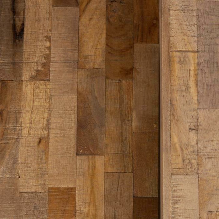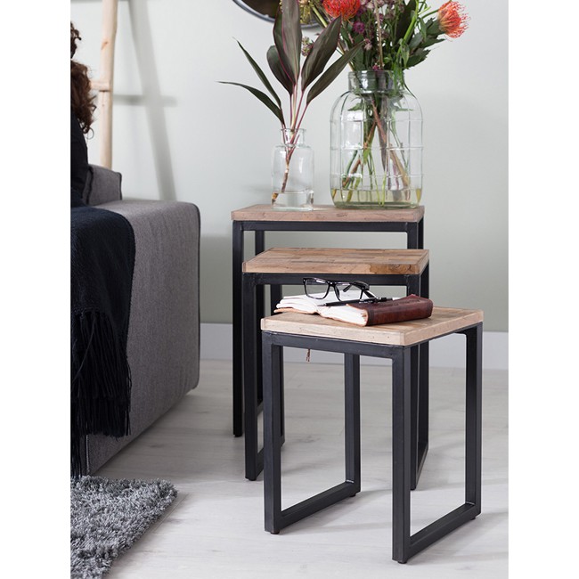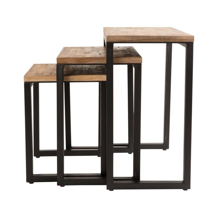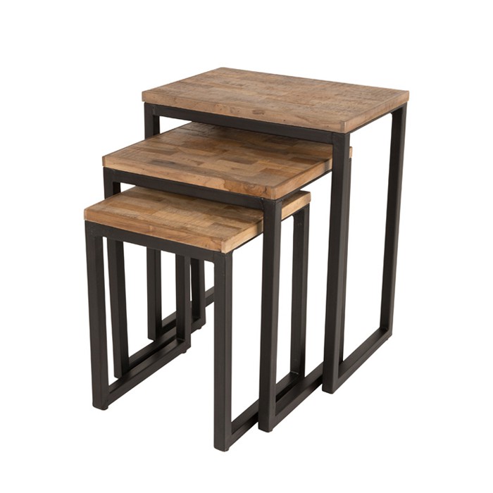 Conjunto 3 mesas auxiliares con tablero de 20mm de teca reciclada , lacado natural ( base de agua ) y bastidor de acero dulce con recubrimiento negro. Medidas: L- 46X31X57cm (WxDxH) M- 38x31x49cm (WxDxH) S-31x31x42cm (WxDxH)
