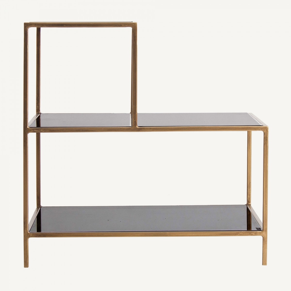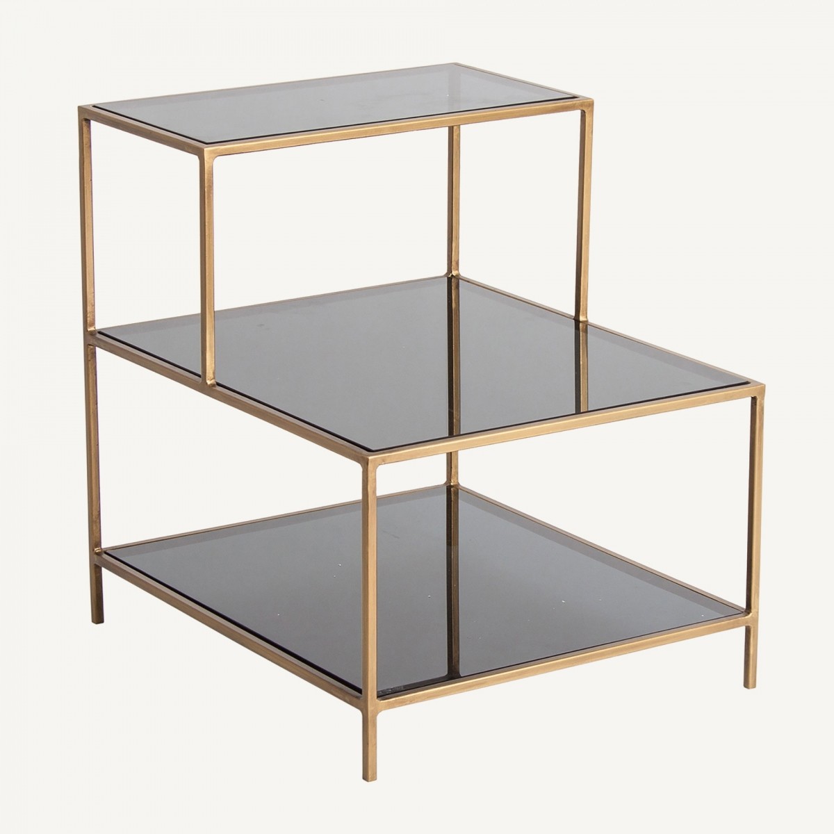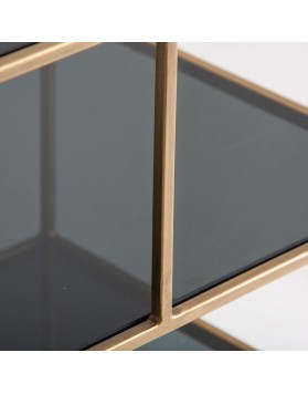 Mesa auxiliar de estilo art decó hecha en hierro y cristal ahumado. Producto desmontable.