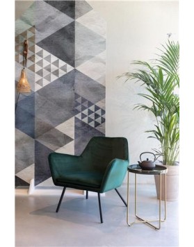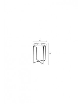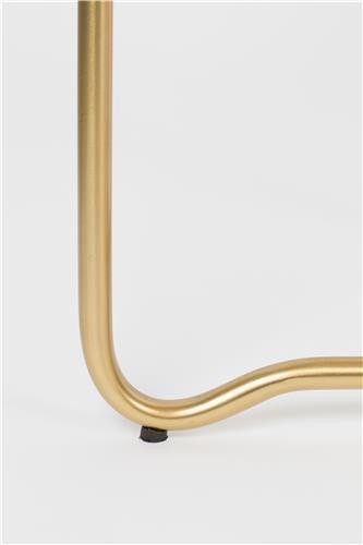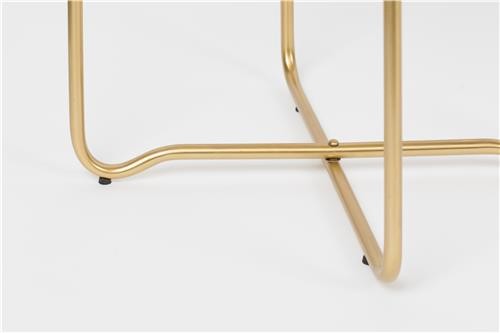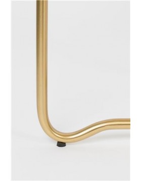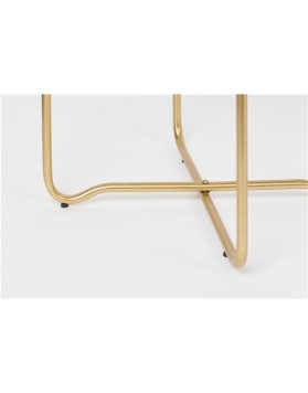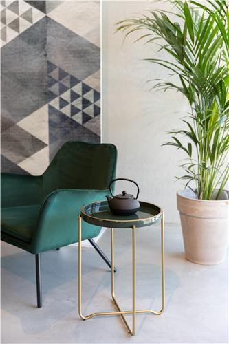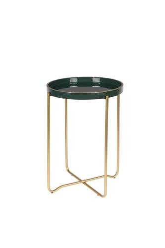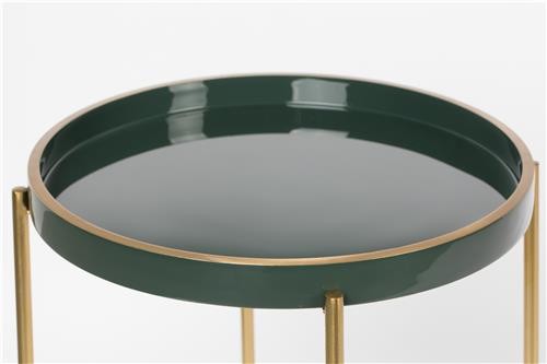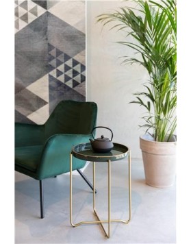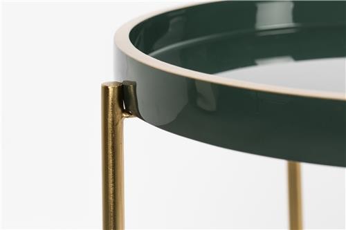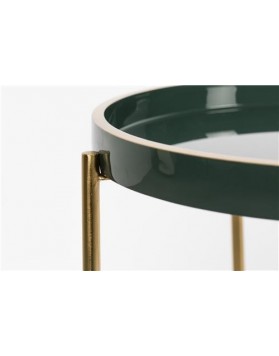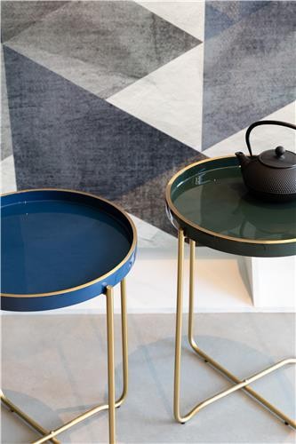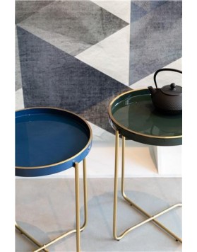 Mesita auxiliar con tablero de aluminio con revestimiento de esmalte, disponible en acabados azul y verde. Base de hierro con recubrimiento de polvo en color dorado.