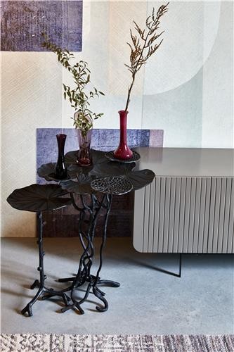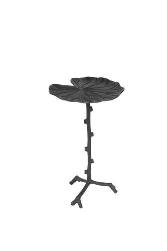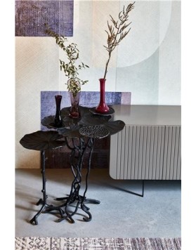 Mesita auxiliar con tablero y base de aluminio galvanizado. Disponible en acabado dorado y en acabado negro.