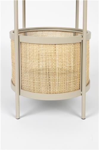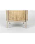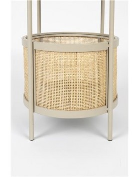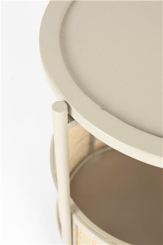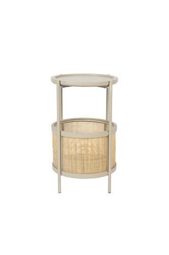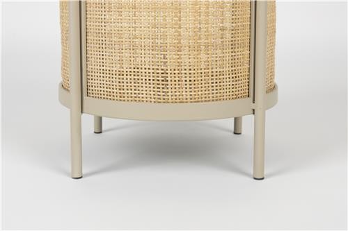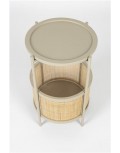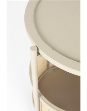 Mesa auxiliar con tablero de MDF con laterales de ratán. Patas de hierro con recubrimiento de polvo. Disponible en dos acabados diferentes: negro y arena