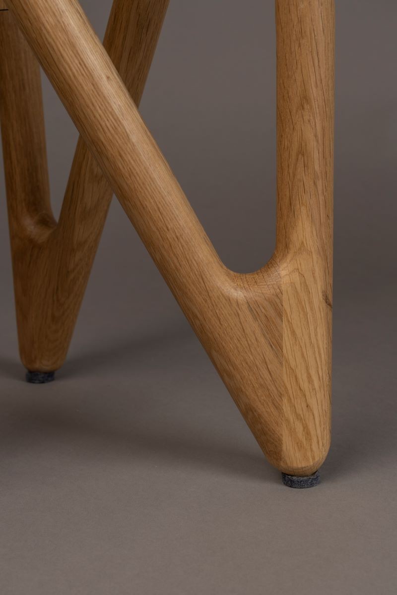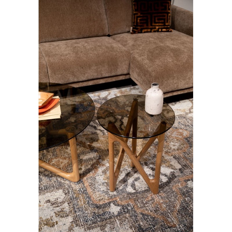 Esta mesa de centro o auxiliar se inspira en el movimiento ondulante del mar reflejado en las formas orgánicas de la base. Además, la madera de roble con acabado natural o nogal desprende mucha calidez. Junto con el tablero redondo de cristal, crea un aspecto atmosférico y ligeramente retro propio de un interior de los años setenta.