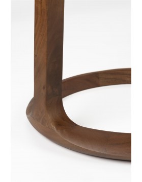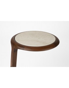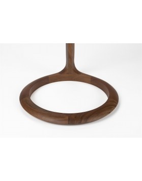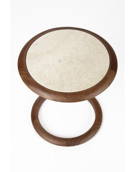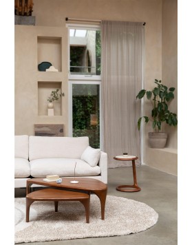 Desde los anillos dobles en su diseño hasta el uso de dos tipos de materiales que contrastan a la perfección. Incluso su función es doble. La mesa crea un ambiente acogedor y, además, es práctica, ya que se puede deslizar sobre el asiento del sofá.