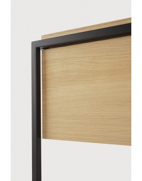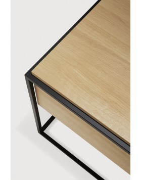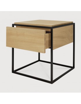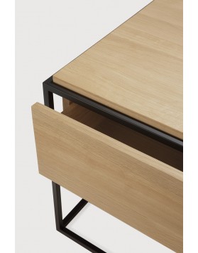 Practicidad sin renunciar al estilo. La minimalista mesita de noche Monolit de roble macizo ofrece un amplio espacio de almacenamiento y sirve de práctico soporte para los objetos de la cabecera.